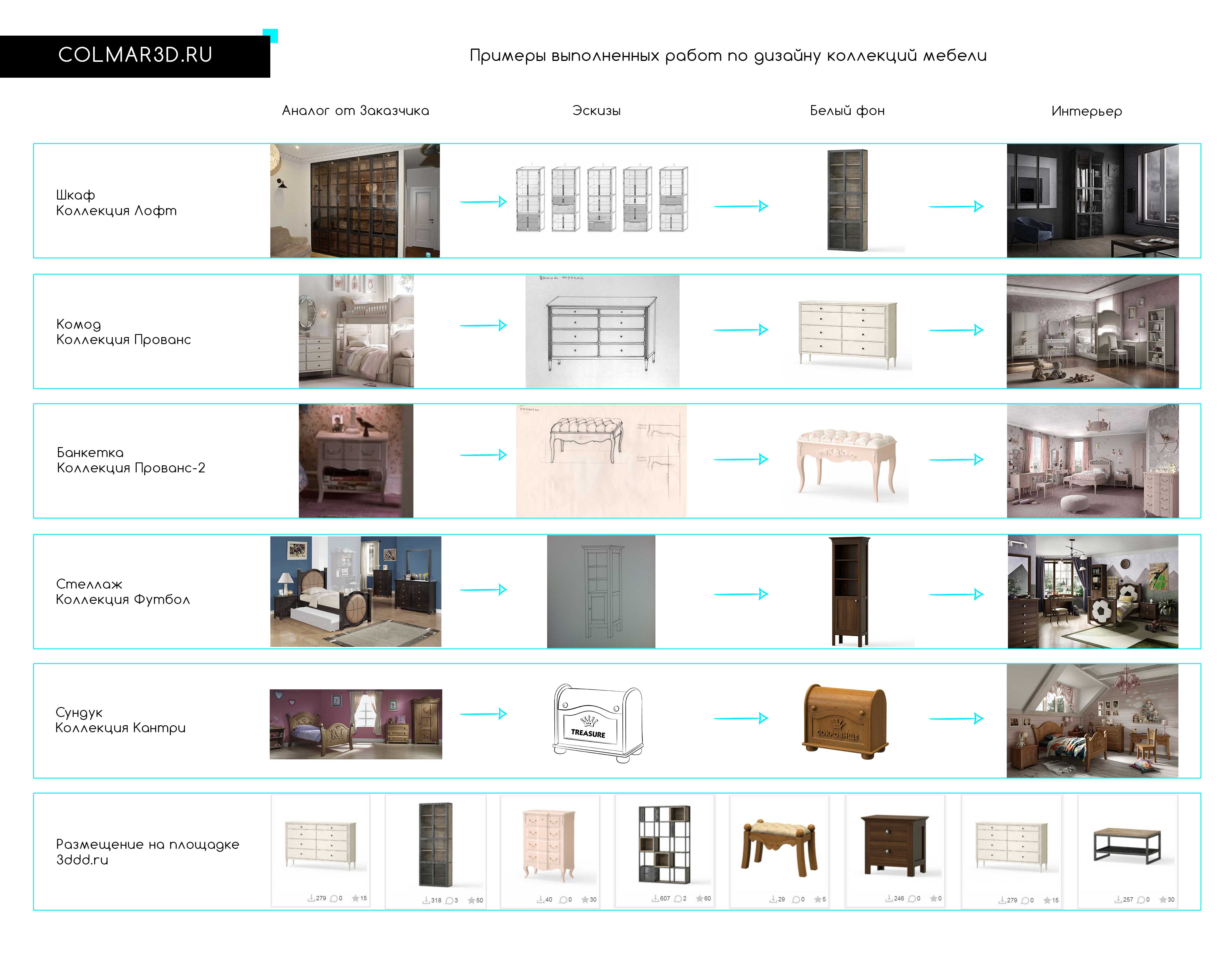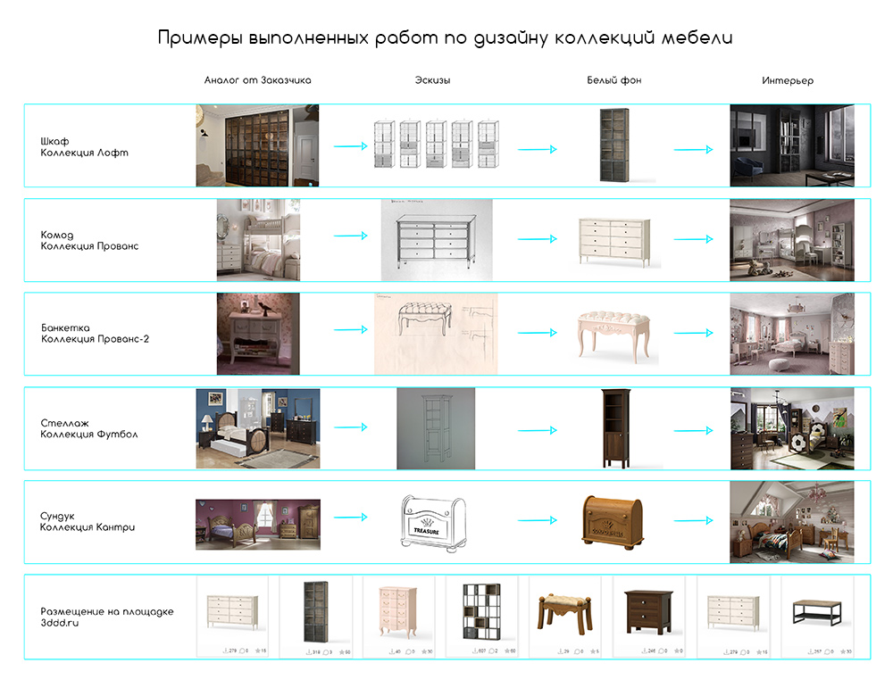Поэтапная разработка дизайна мебели в желаемом вами стиле. |